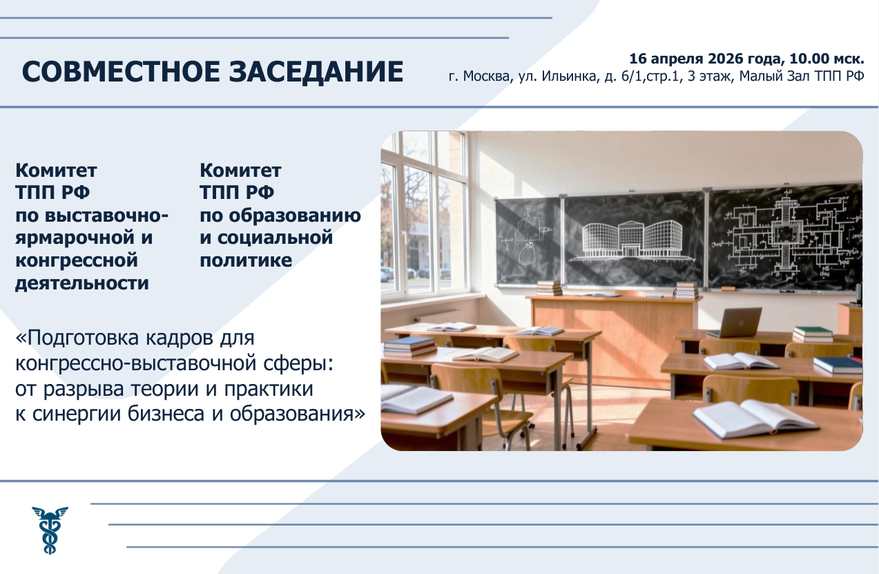 16 апреля 2026 года в 10:00 (мск) в ТПП РФ состоится совместное заседание двух комитетов Торгово-промышленной палаты Российской Федерации, посвящённое вопросам развития кадрового потенциала конгрессно-выставочной отрасли. Место проведения: г. Москва, ул. Ильинка, д. 6/1, стр. 1, 3 этаж, Малый Зал ТПП РФ, гибридный формат.